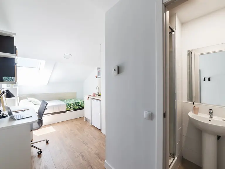 This cosy 12.49 m² single room has a special touch with its sloping ceilings.