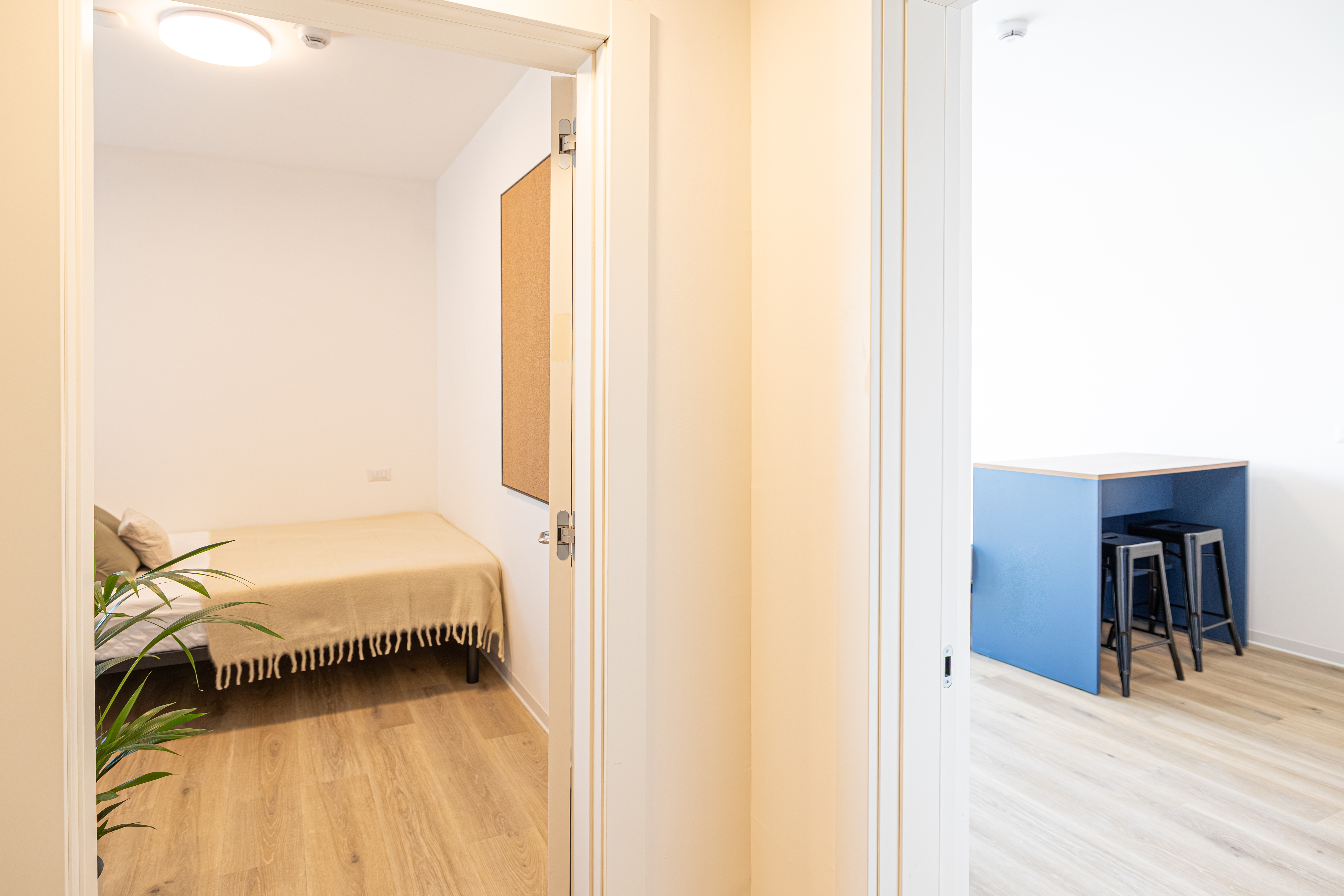 Best view with private balcony and larger bed! Each of our rooms is furnished with everything you need to make your university years an unforgettable experience. We offer you a comfortable environment, in which to feel safe and forge relationships that will accompany you throughout your studies and beyond. Twodio Top is a small apartment consisting of two main rooms with separate entrances and a small anteroom with access to the shared bathroom, located on floor 15 of the building. The indicated price is per person/month. What will you find in your room (each)? Located at floor 15 (top) Approx. 13 sqm 140 cm bed Private balcony Study area with desk and chair, study lamp and shelves Wardrobe Living area with dining table and stools Kitchen with sink, induction hob, electrical and microwave oven, refrigerator and cabinets / cupboards for dishes Centralized heating and cooling with thermostat adjustable temperature (+3/-3 °C) Shared bathroom with big shower **Services included** All inclusive utility bills (No hidden costs) Weekly room cleaning High speed WiFi with up to 25 connectable devices Access to all communal areas Bike parking Maintenance Post and parcel delivery Each room is not equipped with sheets and everything needed (dishes, cutlery, pot&pans,...) for the kitchen. Bathroom is not equipped with towels.