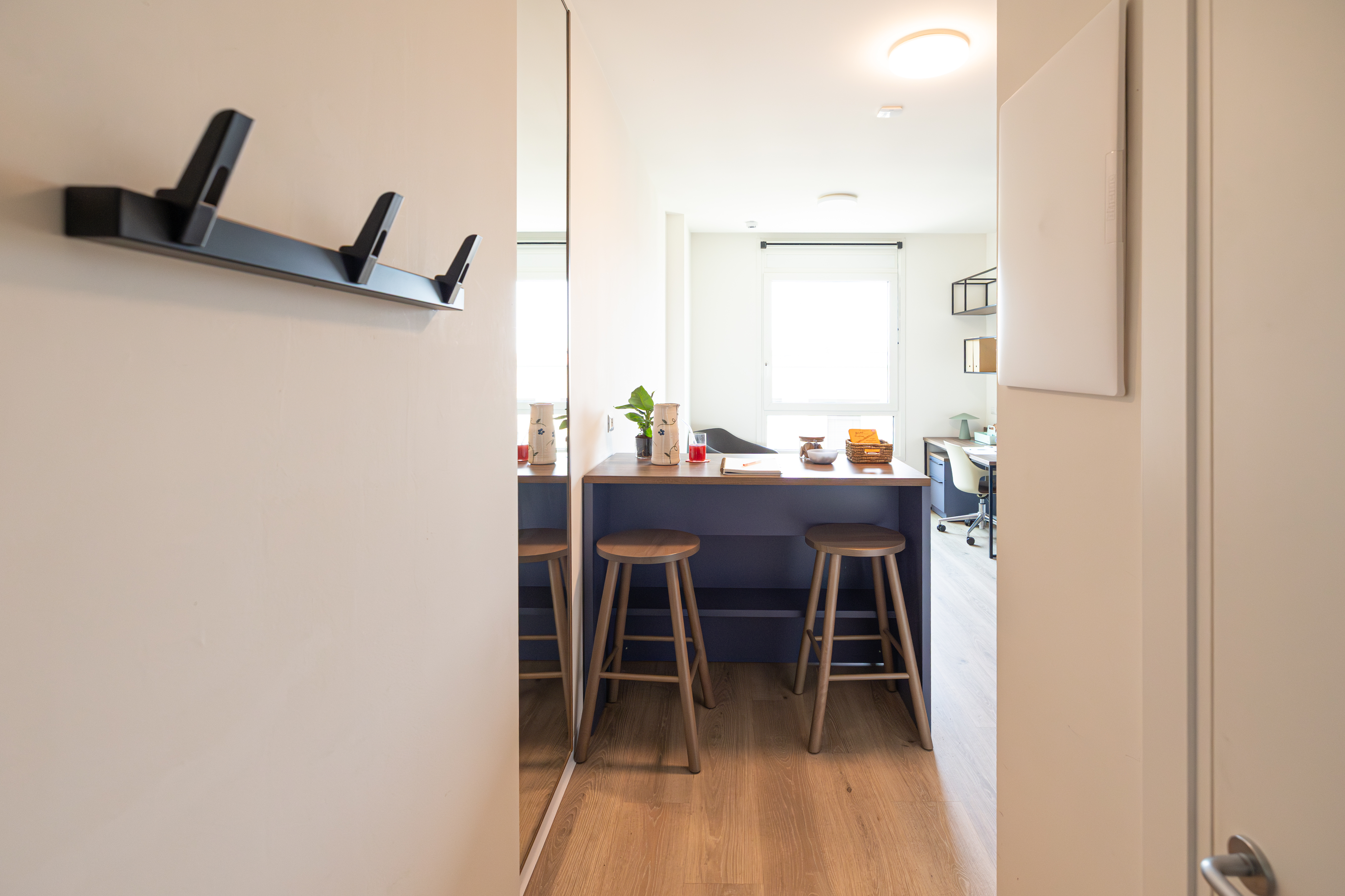 Each of our rooms is furnished with everything you need to make your university years an unforgettable experience. We offer you a comfortable environment, in which to feel safe and forge relationships that will accompany you throughout your studies and beyond. What will you find in your room? Located at floor 4–8 Approx. 15 sqm 120 cm bed Study area with desk and chair, study lamp and shelves Wardrobe Living area with dining table and stools Kitchen with sink, induction hob, electrical and microwave oven, refrigerator and cabinets / cupboards for dishes Centralized heating and cooling with thermostat adjustable temperature (+3/-3 °C) Private bathroom with shower **Services included** All inclusive utility bills (No hidden costs) Weekly room cleaning High speed WiFi with up to 25 connectable devices Access to all communal areas Bike parking Maintenance Post and parcel delivery The room is not equipped with sheets, towels and everything needed (dishes, cutlery, pot&pans,...) for the kitchen.