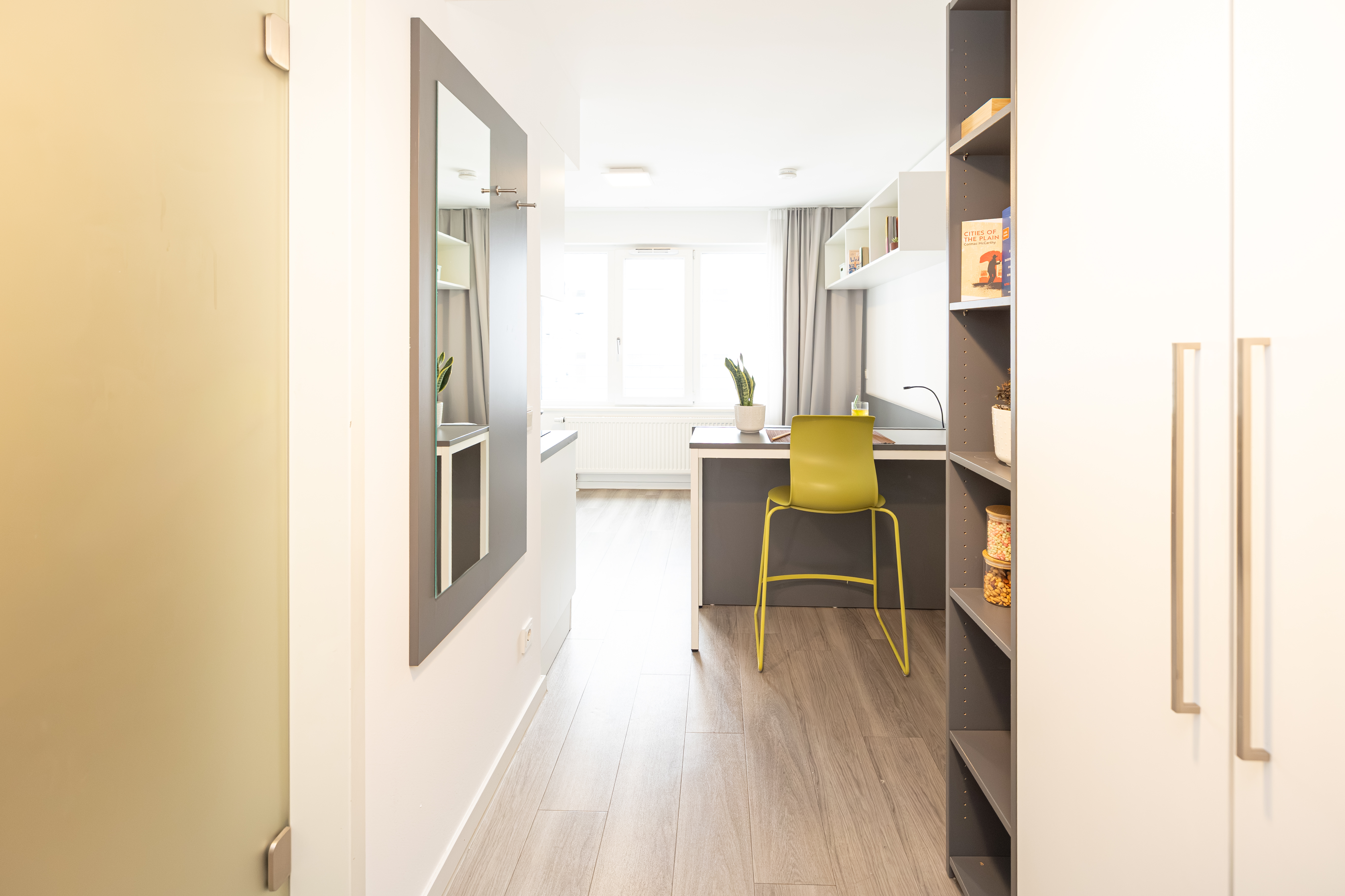 Fully furnished apartment completely fitted out with a large bed and mattress, desk and chair, whiteboard, bar table and stool, kitchenette with twin ceramic hobs, a microwave-grill-combination, sink and fridge-freezer, a spacious ensuite bathroom together with plenty of fitted storage cupboards, shelving, wardrobes as well as a mirror and lighting throughout. All included: Internet, Water, Heating and air conditioning, 24h security, Unlimited access to common areas: gym, study room, games room…