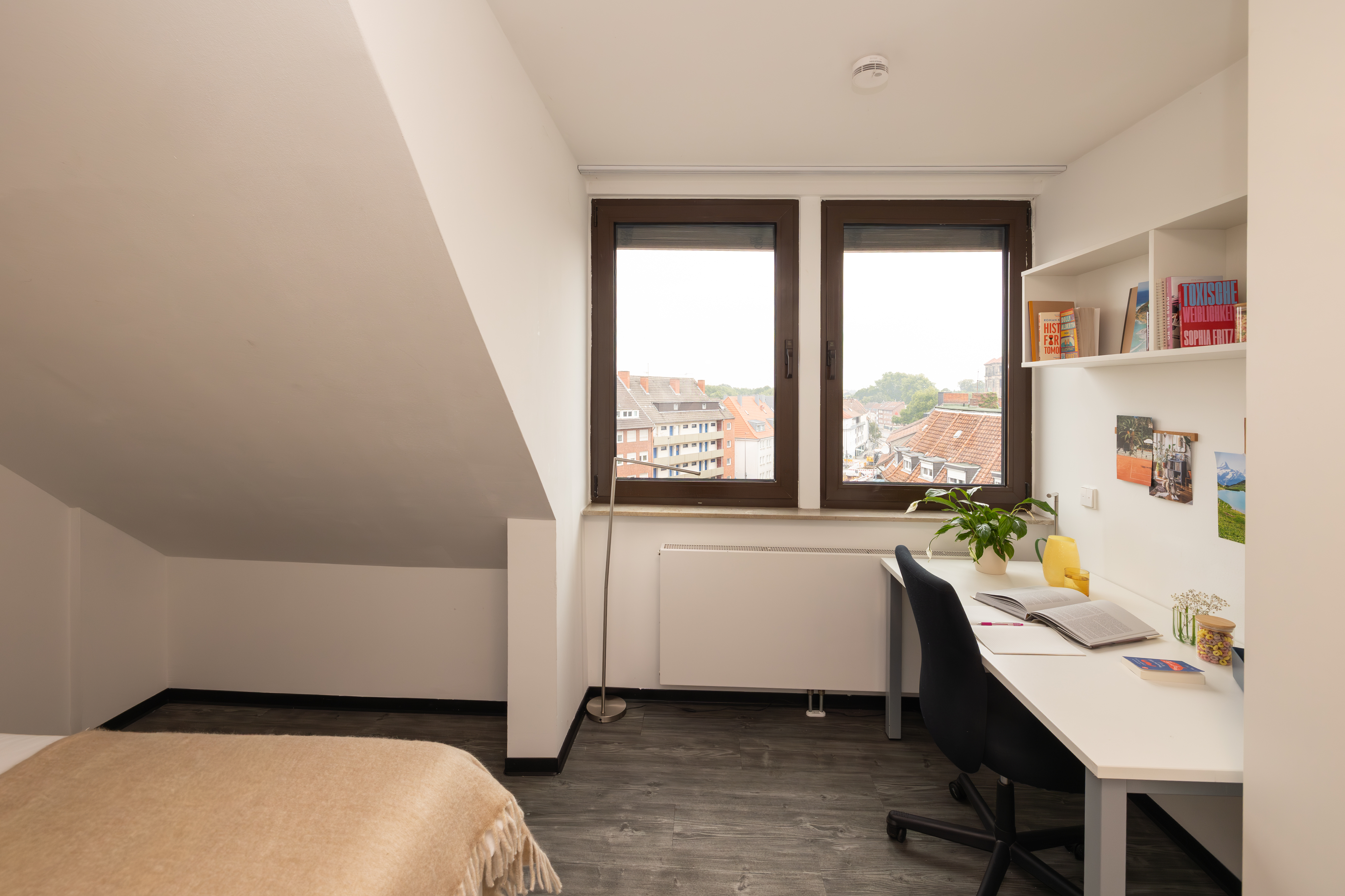 Spacious apartment for two people, each with their own private sleeping and study area fully furnished with a bed and mattress, desk and chair and plenty of storage cupboards, shelving and wardrobe, together with a shared kitchen and dining space with table and chairs, kitchenette and a spacious shared bathroom with shower, washbasin and WC. From 18 sqm. All included: Internet, Water, Heating and air conditioning, 24h security, Unlimited access to common areas: gym, study room, games room…