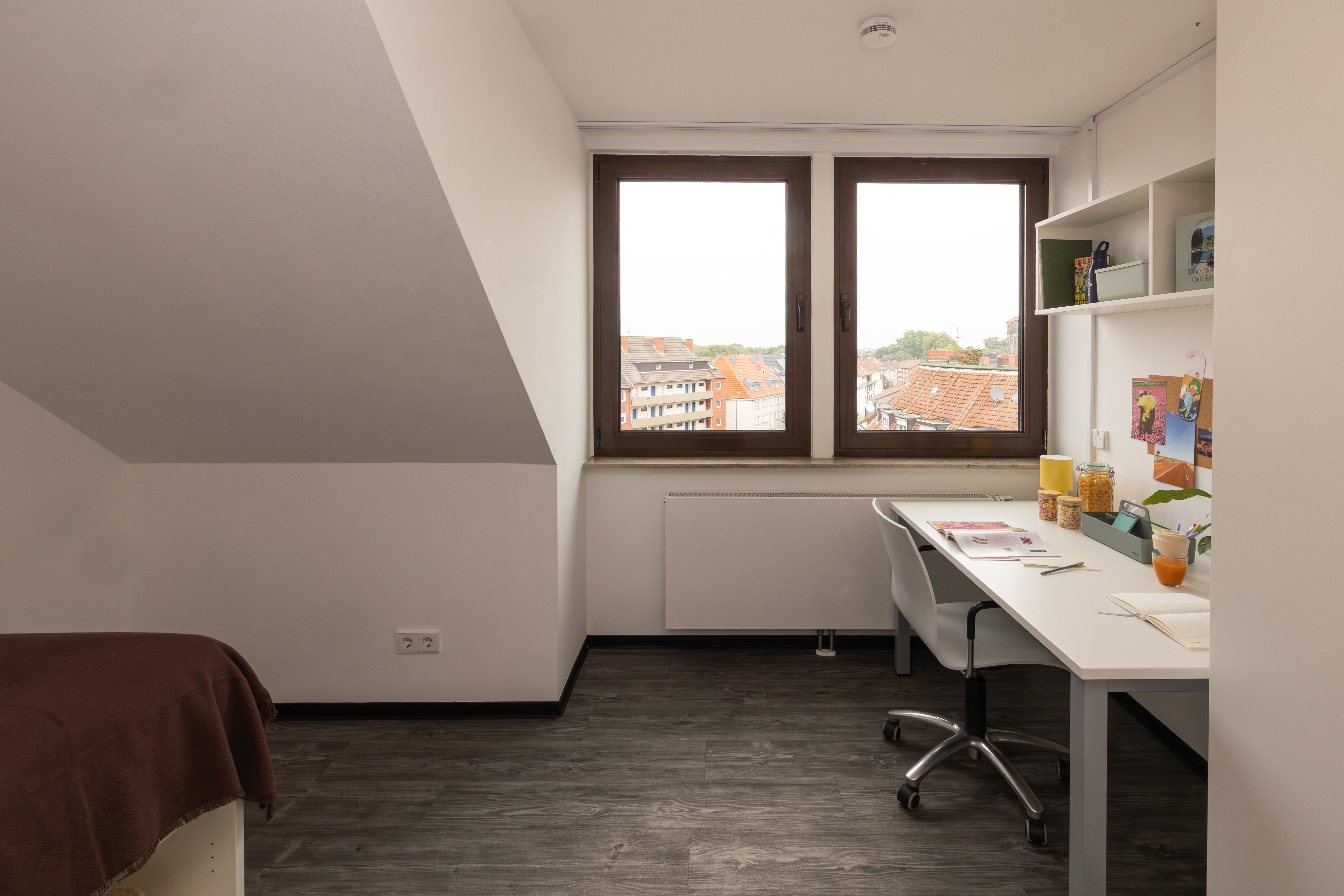 Fully furnished and equipped room, with fridge and microwave. 1.2x2m bed, with storage space, study area with large desk, spacious wardrobe and shelves. Bathroom PMR and private terrace. All included: Internet, Water, Heating and air conditioning, 24h security, Unlimited access to common areas: gym, study room, games room…