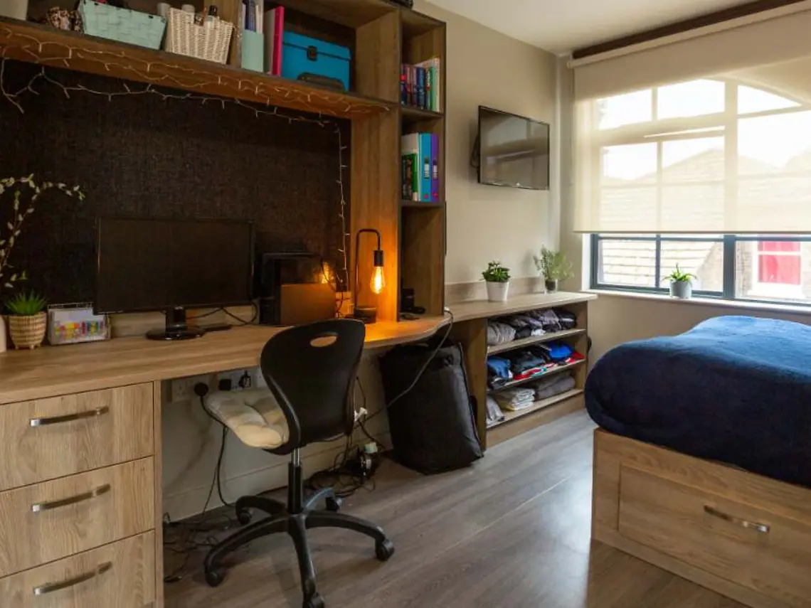 Room size of 15.9m². Double bed with under-bed storage; bedside table; bean bag chair (on request); full-length mirror; office chair; blackout blind; pin board; shelves; study desk with drawers; 32" TV*; double wardrobe; en-suite shower room with WC; kitchenette with a hob, microwave, oven, an integrated fridge with a freezer compartment, and dining space. Please note the description should be treated as general guidance. Furniture and appliance combinations may vary within room types. TV license not included.