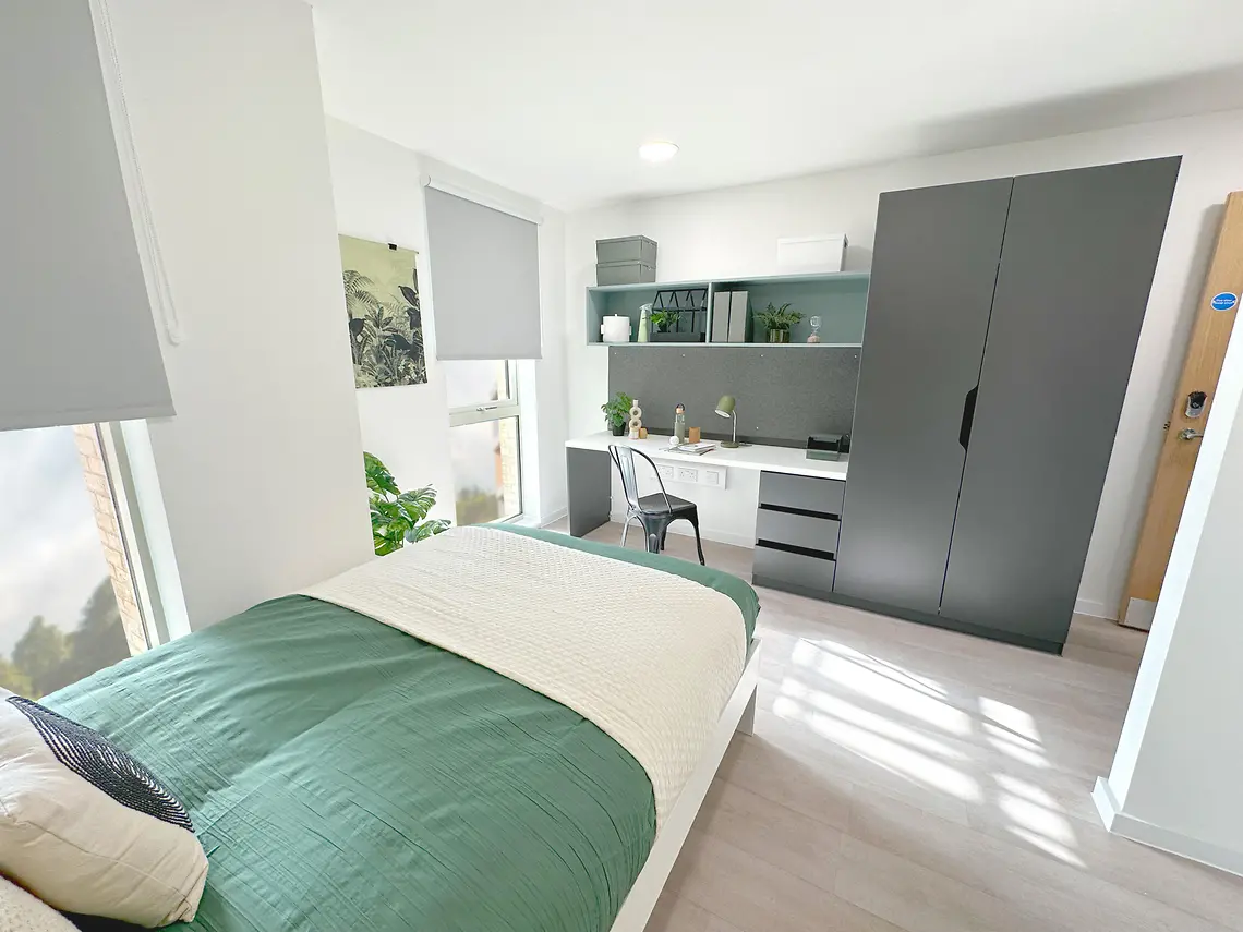Room size: 17m². What's in the room? 3/4 bed with underbed storage; chair & desk area; wardrobe and drawers; private en-suite bathroom. What's in the shared kitchen? Shared kitchen with hob, oven, fridge/freezer; plenty of storage space; dining table and seating; lounge area with coffee table and TV. Floorplans and room sizes may vary slightly.