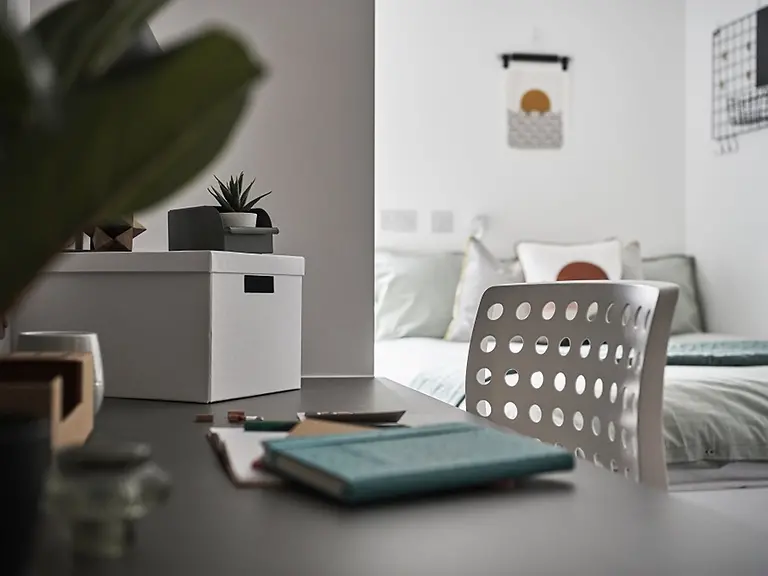 Room sizes vary from 12.5m² to 16.6m². In room: double bed with under storage, en-suite bathroom, bedhead light, study desk, desk chair, wardrobe, drawers, notice board, tall mirror, wall mounted shelf. Kitchen: freestanding oven, integrated 4 ring hob, extractor hood, microwave, fridge freezer freestanding, under counter dishwasher, dining table and chairs, bean bag chairs, TV, coffee table, fire blanket, drainer sink, mixer tap, general waste & recycle bins.