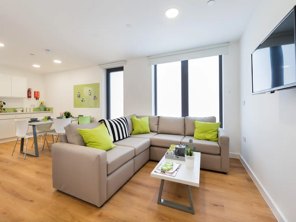 ¾ size double bed with under bed storage. Wardrobe. En-suite bathroom with shower and WC. Full-length mirror. Study desk with drawer space and chair. Full-size fridge freezer. Electric oven. 2-ring hob with extractor. All included: Internet, Water, Heating and air conditioning, 24h security, Unlimited access to common areas: gym, study room, games room…