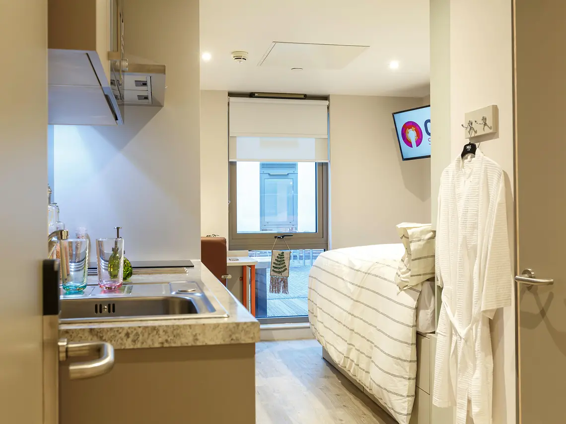 ¾ size double bed with under bed storage. Private en-suite shower room. Private kitchen area with microwave oven, under counter fridge/freezer, 2 ring induction hob and sink. Study space with desk and chair. 32" TV. USB sockets. Wardrobe. Bedside table. Blackout blind. Coat hooks. Dining area. Mirror. Peg board. Private room access. Shelves. What's in the shared kitchen and dining area? Four ring induction hob. Integrated combination oven. Full sized fridge freezer. Dining space with table and chairs. Lounge / Sofa area. 50" TV in sofa area. The £100 deposit is deductible from total rental amount. This deduction will be reflected in your lease agreement that you'll receive once the deposit is paid. All included: Internet, Water, Heating and air conditioning, 24h security, Unlimited access to common areas: gym, study room, games room…