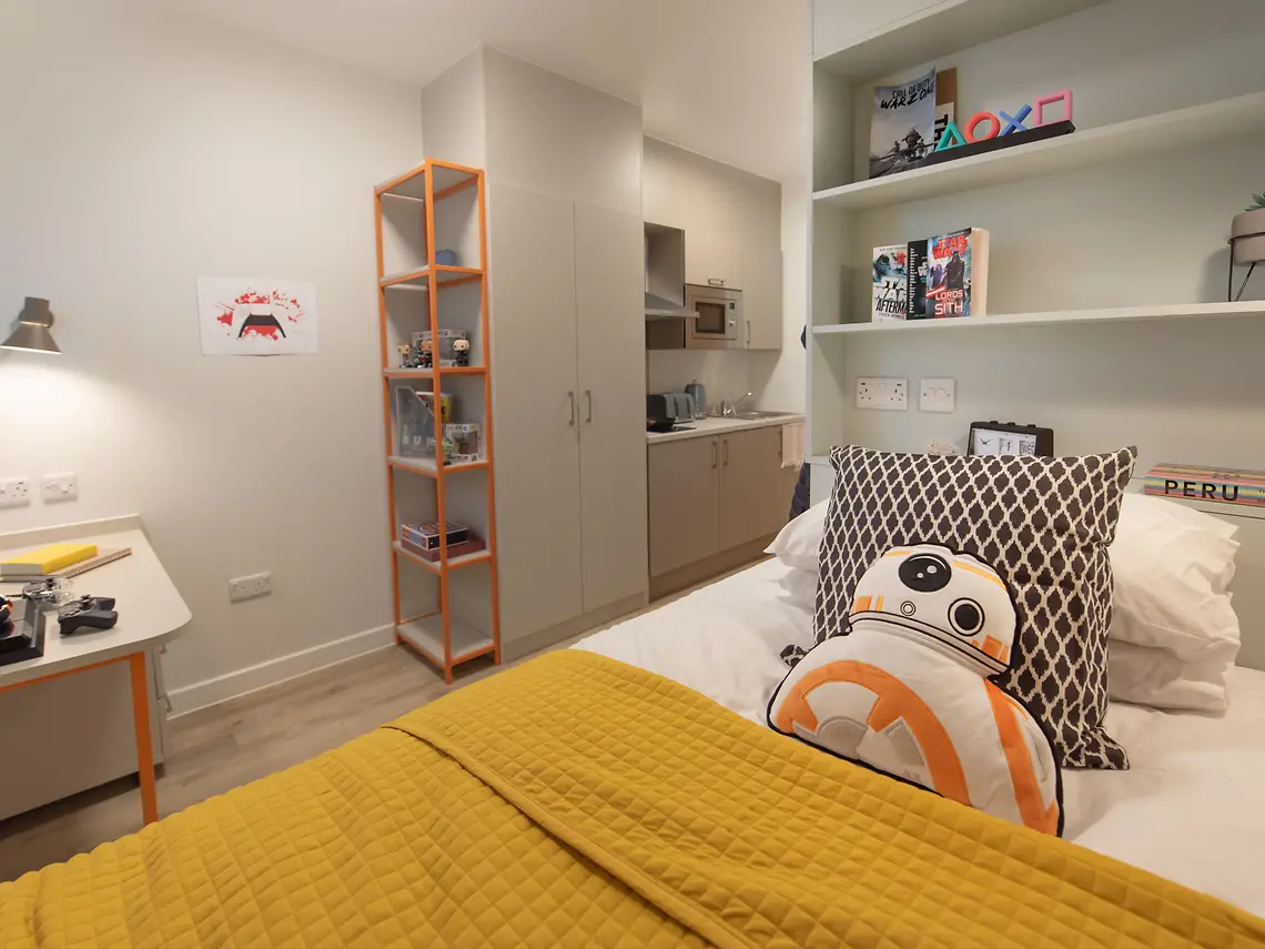 ¾ size double bed with under bed storage (4ft x 6ft). Private en-suite shower room. Private kitchen area with microwave oven, under counter fridge/freezer, 2 ring induction hob and sink. Study space with desk and chair. 32" TV. USB sockets. Wardrobe. Blackout blind. Coat hooks. Peg board. Private room access. Shelves. Mirror. What's in the kitchen? Four ring induction hob. Integrated single oven. Full sized fridge freezer. Dining space with table and chairs. Lounge / Sofa area. 50" TV in sofa area. The £100 deposit is deductible from total rental amount. All included: Internet, Water, Heating and air conditioning, 24h security, Unlimited access to common areas: gym, study room, games room…