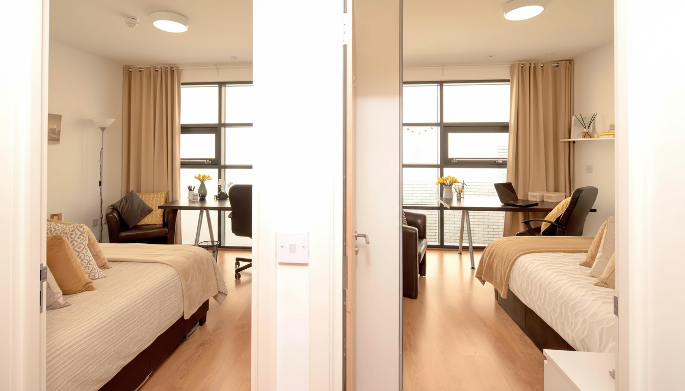 Medium Twin Apartment (16 sqm) with two separate furnished bedrooms, fully fitted kitchen and bathroom.