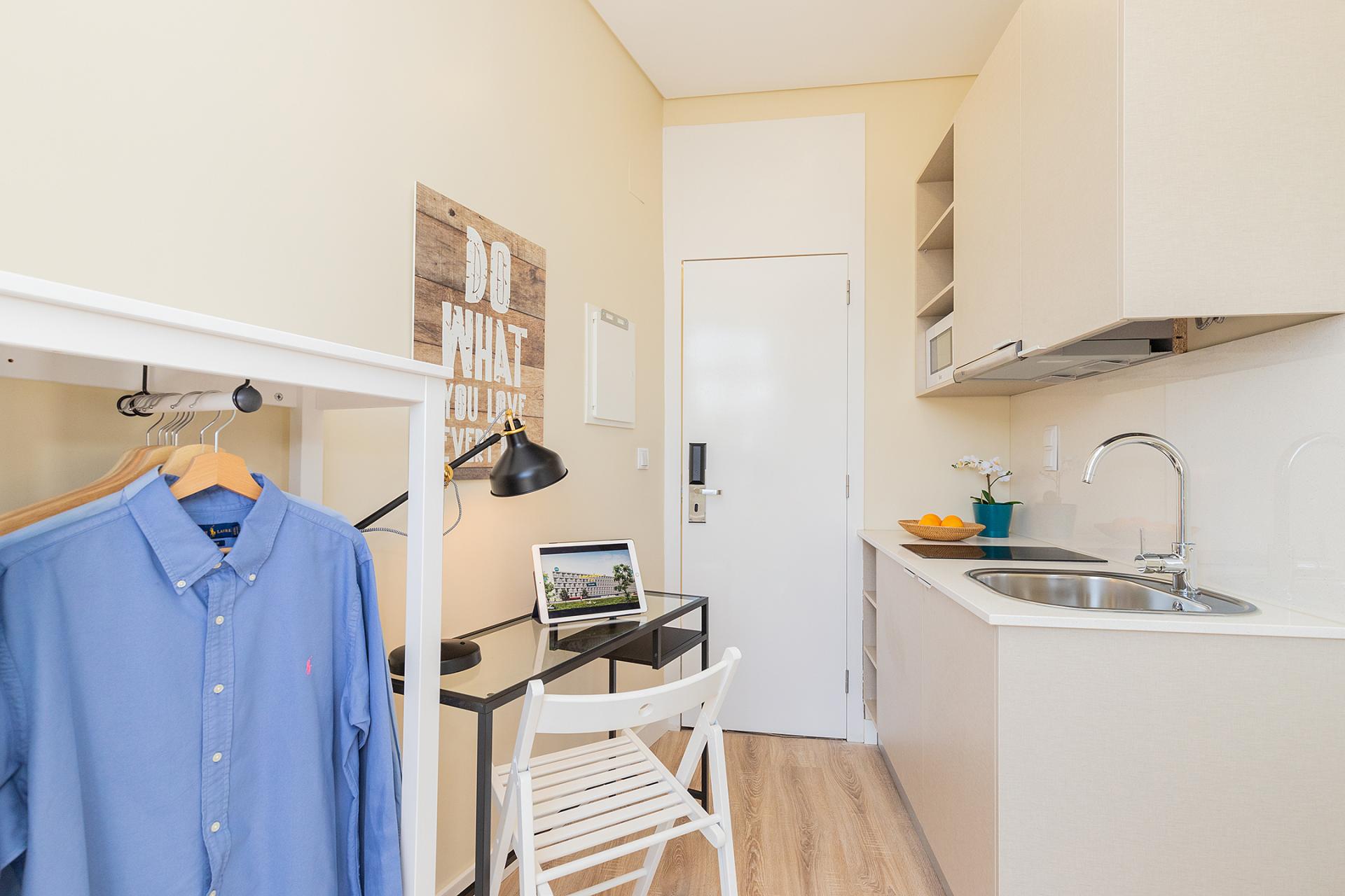 Ajuda has everything you need for the ultimate student experience: stylish studios, incredible social spaces, year-round events…and so much more.Our standard studios have been thoughtfully designed to ensure your privacy and comfort, whilst giving you access to a range of incredible common spaces and year-round residence events so you can feel right at home. Every standard studio is 9m2 and has: -Private bathroom with a shower -Kitchenette including a fridge with freezer shelf -Compact single bed with comfy mattress and bedside table - Wardrobe with drawers and hanging space - Study desk and chair These standard studios are located on floors -1, 0, 1and 2. Our central location in Lisbon means you’re only a short ride from universities and the great food on offer in Ajuda! All this is included in your rent as standard: - Utility bills (no extra fees for electricity, water or gas) - Super fast WiFi - Friendly residence team and 24/7 security - Cozy common spaces - Year-round events - Access to the App and Wellbeing Hub (resources to manage your emotional wellbeing) - Exclusive local discounts Come live with us at Ajuda! Just a couple of minutes from the city centre and all major universities in Lisbon. We’ve thought of all the details, so you don’t have to. Make Ajuda your next home when you book your stay and experience premium living.