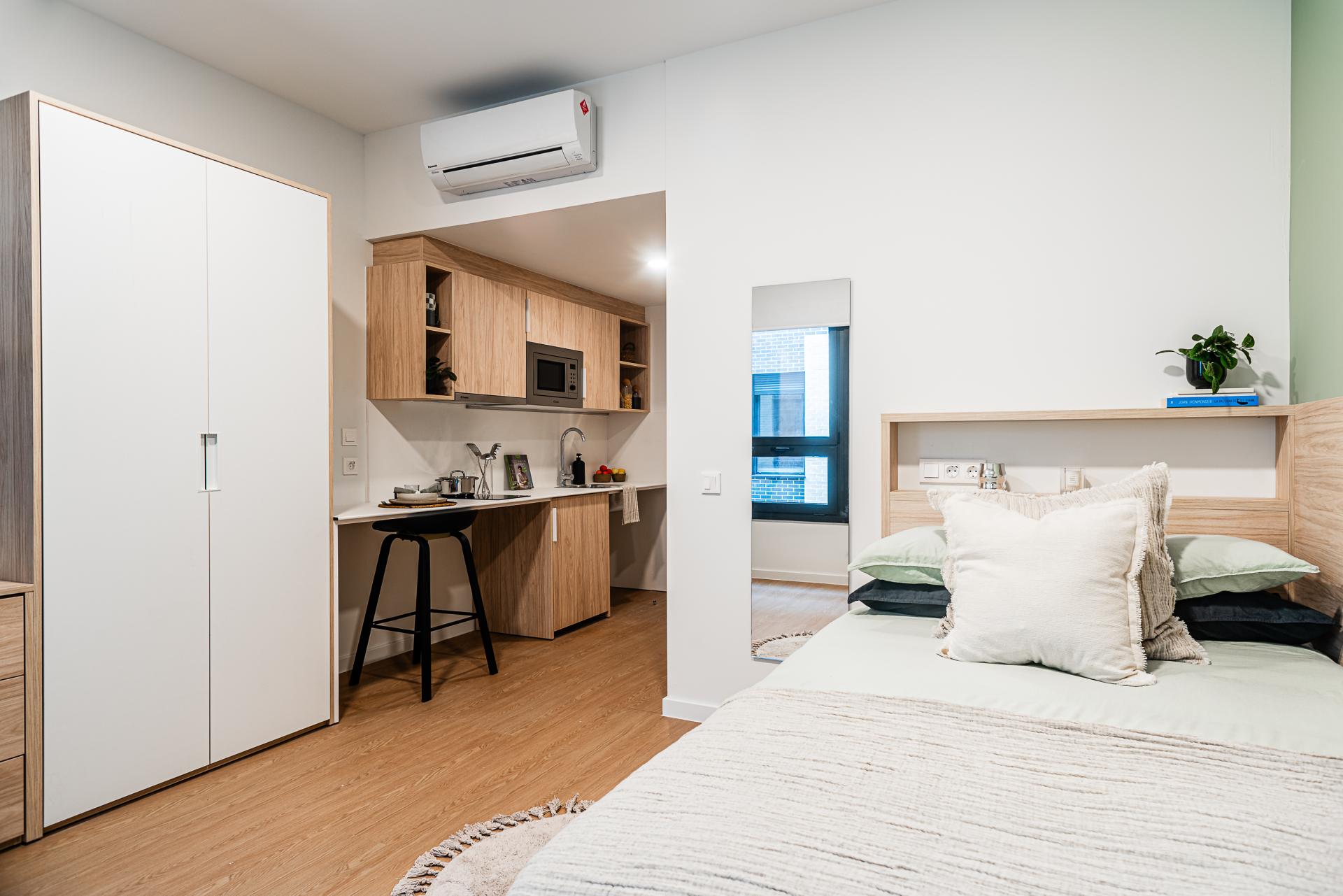 Welcome to Aravaca, your stylish student home in one of Madrid’s most vibrant neighbourhoods. With great transport links and everything you need nearby, you're just minutes from the city’s top universities and hangouts. Our Classic Studios (Accessible) are 20–22m² and located on the ground to fourth floors. These studios are spacious and wheelchair-friendly, with a private bedroom, ensuite bathroom, and kitchenette - perfect for students who want privacy and comfort. What’s included in your Classic Studio (Accessible): * Compact double bed * Study desk and chair * Wardrobe with shelving * Full-length mirror * Private ensuite bathroom (wheelchair accessible) * Kitchenette with: induction hob, combi microwave oven, fridge, and storage Perfectly located for students in Madrid: * 2-min walk to IEB * 30-min bus to Universidad Francisco de Vitoria (UFV) * 40-min walk to CEU San Pablo * 27-min bus to ESIC * 18-min bus to Universidad Complutense de Madrid (UCM) With bi-weekly cleaning, laundry facilities, outdoor terraces, a 24/7 residence team, the app and a full calendar of events, you’ll feel right at home from day one. Make Aravaca your new home and join the community today!