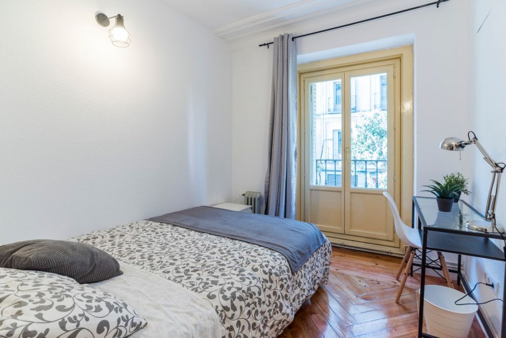 Room with balcony in Chueca, in the centre of Madrid. It's fully equipped with a double bed (135 cm), a desk with a chair and a lamp, and a double wardrobe. The room measures 9.56 m², it has heating and a door lock. It's perfect for young students and workers who want to have a pleasant stay. *Bedding is not included, only a mattress cover is provided. - Don't smoke - Pets are not allowed - Parties are forbidden - Take out the trash daily - Short-term visits are allowed - be informed that in this flat a device has been installed in order to allow the monitoring of the noise level (decibels) 24 hours a day. The system emits an alert whenever the sound level exceeds the maximum allowed by the Community of Madrid, mainly between 11pm and 6am.