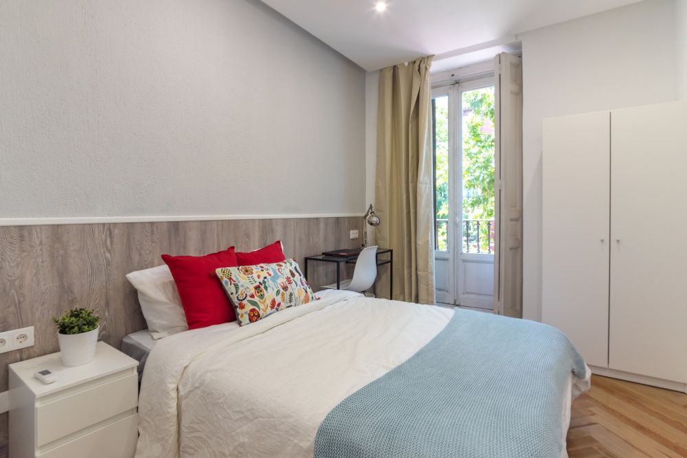 Double room in Carranza Street, located in the centre of Madrid. It's fully equipped with a double bed (135 cm), a wardrobe, a desk with a chair and a lmap and a bedside table. It has a balcony overlooking the street. The room measures 10.04 m² , it has heating and a door lock. This room is perfect for young students and workers who want to have an amazing stay. *Bedding is not included, only a mattress cover is provided. - Don't smoke - Pets are not allowed - Parties are forbidden - Take out the trash daily - Short-term visits are allowed - be informed that in this flat a device has been installed in order to allow the monitoring of the noise level (decibels) 24 hours a day. The system emits an alert whenever the sound level exceeds the maximum allowed by the Community of Madrid, mainly between 11pm and 6am.