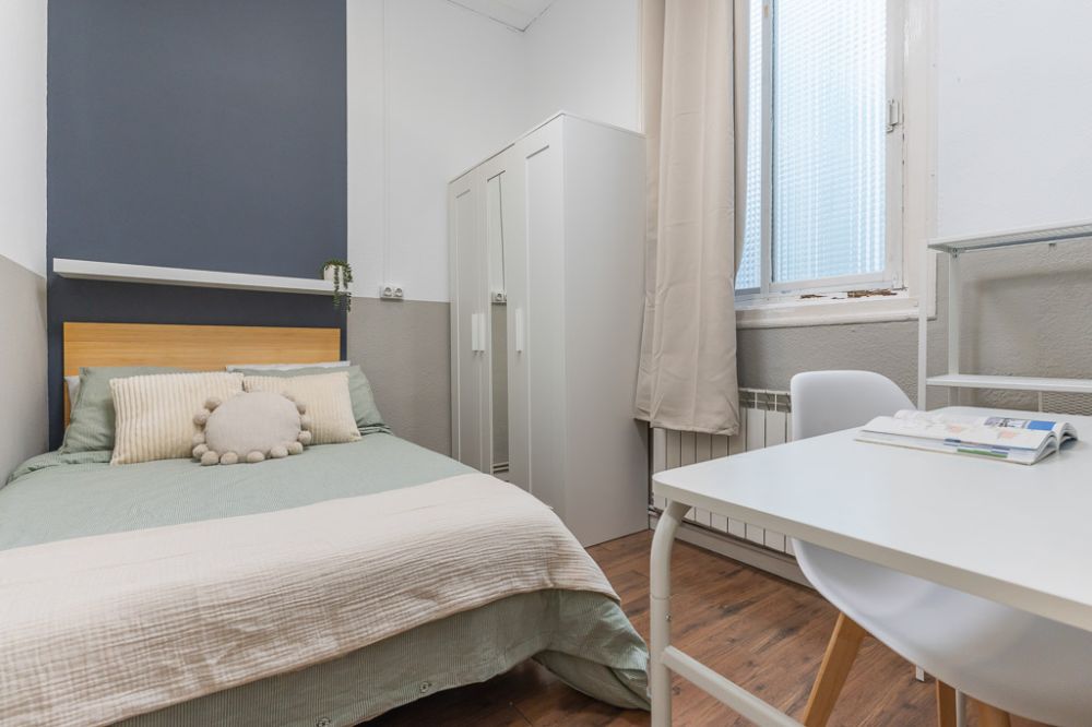 Wonderful room in Caños del Peral. This 7,04 m² room is furnished with a 135 cm double bed, double wardrobe, wall mirror, metal shelf, desk with lamp and chair and ceiling fan. The kitchen and dining room are shared with the other tenants. *Bed linen is not included, only the mattress cover is provided. - No smoking. - No pets allowed. - No parties allowed. - Take out the rubbish daily. - Short-term visitors are allowed. - be informed that this flat is equipped with a device that monitors noise levels or decibels 24 hours a day, issuing an alert when the sound level exceeds the maximum allowed by the Community of Madrid, mainly between 11 p.m. and 6 a.m.