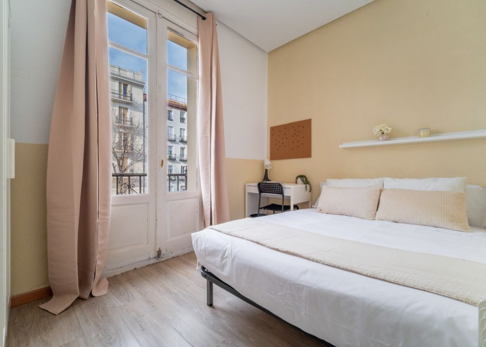 Spectacular room in Quevedo, ideal for international students and young professionals. The room is equipped with everything needed to enjoy your stay; it has a double bed (135 cm), a desk with chair and lamp, a mirror, and a wardrobe. Additionally, it has a magnificent exterior balcony. The room measures 7.66 m². It has heating and its own lock, for greater privacy. This room is located on the second floor of the building. The kitchen and dining room are shared with the apartment tenants. For more details, we invite you to see the floor plan and the location of the room. *Bed linen is not included, only a mattress protector is provided. - Don't smoke - Pets are not allowed - Parties are forbidden - Take out the trash daily - Short-term visits are allowed - be informed that in this flat a device has been installed in order to allow the monitoring of the noise level (decibels) 24 hours a day. The system emits an alert whenever the sound level exceeds the maximum allowed by the Community of Madrid, mainly between 11pm and 6am.
