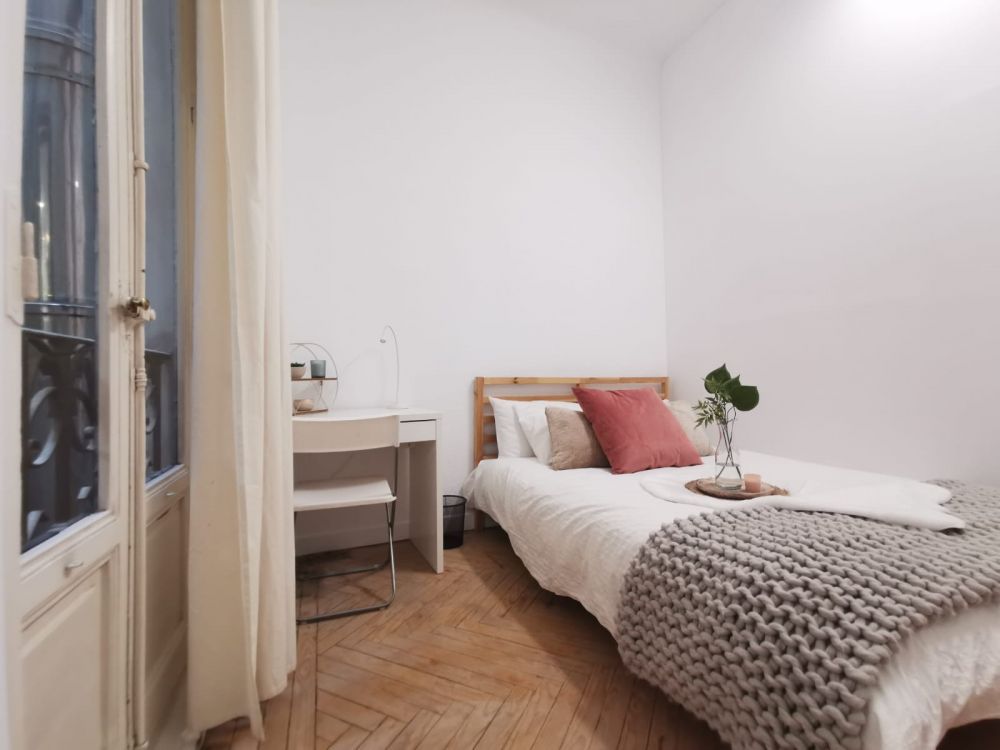 Nice and cozy room located in Preciados, in the heart of Madrid. It has a large balcony overlooking the inner courtyard of the building. It comes equipped with everything you need to enjoy the stay, such as a double bed (140 cm), a single wardrobe, a wall mirror and a desk with a lamp. In this charming room you will feel like home. The room measures 9.63 m², it has a door lock and electric heating. *Bedding is not included, only a matress cover is provided.* - Don't smoke - Pets are not allowed - Parties are forbidden - Take out the trash daily - Short-term visits are allowed - be informed that in this flat a device has been installed in order to allow the monitoring of the noise level (decibels) 24 hours a day. The system emits an alert whenever the sound level exceeds the maximum allowed by the Community of Madrid, mainly between 11pm and 6am.