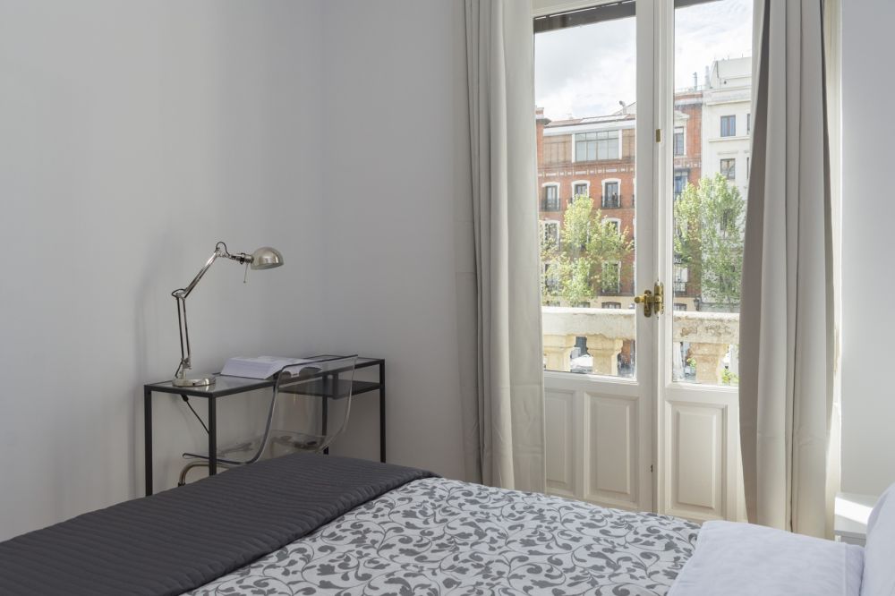 This wonderful room has a huge balcony with views to one of the most beautiful squares in Madrid, Plaza de Santa Ana. It's fully equipped with a double bed (135 cm), a large built-in wardrobe, a bedside table and a desk with a lamp and a ceiling fan. It's perfect for young workers and students. The size of the room is 12 m², it has its own lock and central heating. *Bedding is not included, only a matress cover is provided. - Don't smoke - Pets are not allowed - Parties are forbidden - Take out the trash daily - Short-term visits are allowed - be informed that in this flat a device has been installed in order to allow the monitoring of the noise level (decibels) 24 hours a day. The system emits an alert whenever the sound level exceeds the maximum allowed by the Community of Madrid, mainly between 11pm and 6am.