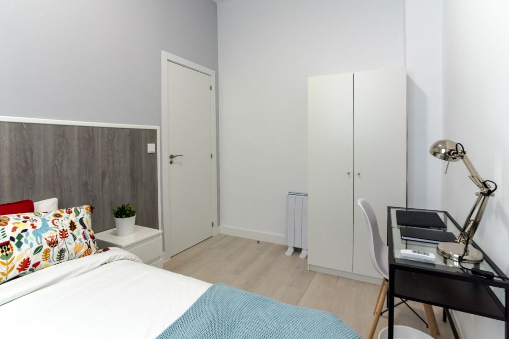 Beautiful modern room in Fuencarral, in the centre of Madrid. It's furnished with a double bed (135 cm), a bedside table, an individual wardrobe, a desk with a chair and a lamp, and an interior window. The room measures 8.07 m², it has heating and a door lock. In here young students and workers will have a unique experiencie. *Bedding is not included, only a mattress cover is provided. - Don't smoke - Pets are not allowed - Parties are forbidden - Take out the trash daily - Short-term visits are allowed - be informed that in this flat a device has been installed in order to allow the monitoring of the noise level (decibels) 24 hours a day. The system emits an alert whenever the sound level exceeds the maximum allowed by the Community of Madrid, mainly between 11pm and 6am.