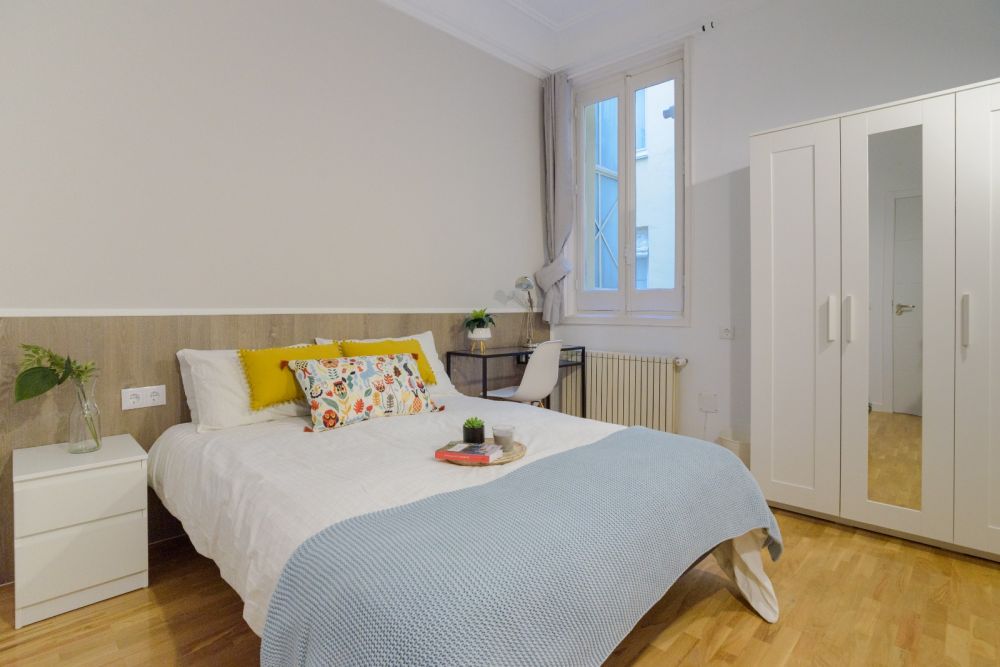 Double room in Valenzuela street, equipped with all the essentials. The room has a double bed (135x190 cm), a double wardrobe with mirror, a bedside table and a desk with a chair and a lamp. It has a window facing the interior courtyard. It's perfect for international students and young workers. The room includes its own lock and it measures 10.58 m². *Bedding is not included, only a mattress cover is provided. - Don't smoke - Pets are not allowed - Parties are forbidden - Take out the trash daily - Short-term visits are allowed - be informed that in this flat a device has been installed in order to allow the monitoring of the noise level (decibels) 24 hours a day. The system emits an alert whenever the sound level exceeds the maximum allowed by the Community of Madrid, mainly between 11pm and 6am.