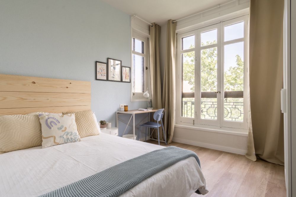 Spacious room in Alberto Aguilera street. It is equipped with a double bed (135x190), a double closet, a bedside table and a desk with a chair and a lamp. It is very bright. The size of the room is 10,49 m², it has a door lock, air conditioning and heating. Young international students and workers will feel at home here in the city center. *Bed linen is not included. - No smoking - No pets allowed - No parties - Trash must be taken out daily - Short-term visitors are allowed - be informed that in this apartment is installed a device that allows to control the noise level or decibels 24 hours a day, issuing an alert when the sound level exceeds the maximum allowed by the Community of Madrid, mainly between 23.00 and 6.00 hours.