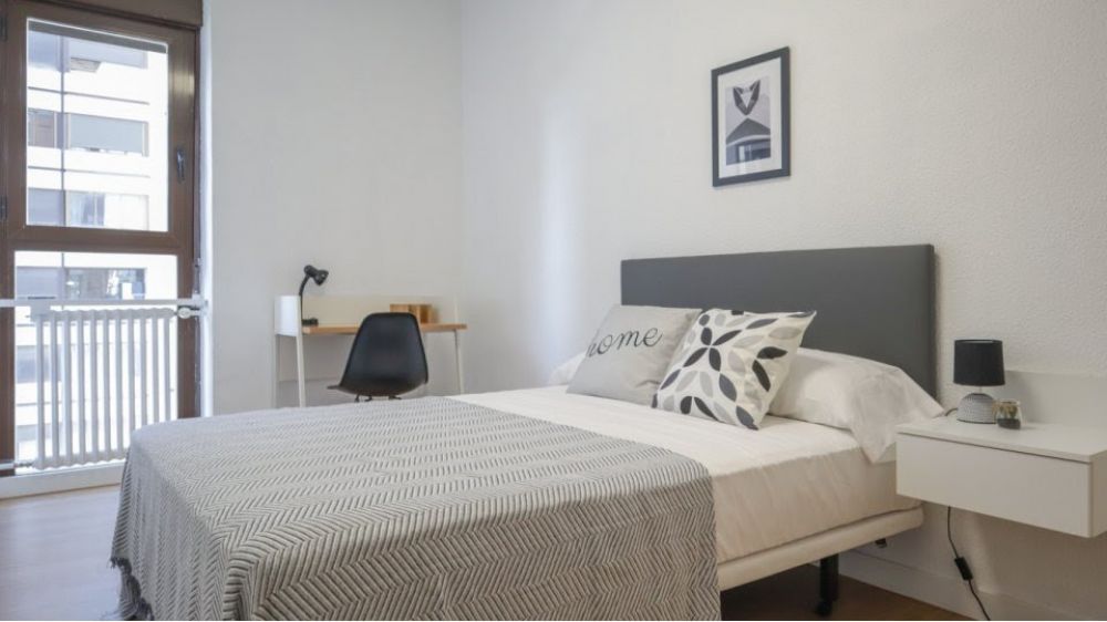 Spectacular room (10,77m²) in the north of Madrid near Nuevos Ministerios in Orense Street fully equipped with a built in closet, a double bed, aircon a desk with a lamp. Perfect for a comfortable stay in the city! *Bedding is not included, only a mattress cover is provided and each room has its own lock. - Don't smoke - Pets are not allowed - Parties are forbidden - Take out the trash daily - Short-term visits are allowed * be informed that in this flat a device has been installed in order to allow the monitoring of the noise level (decibels) 24 hours a day. The system emits an alert whenever the sound level exceeds the maximum allowed by the Community of Madrid, mainly between 11pm and 6am.