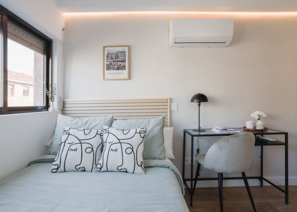 Spacious room with private bathroom located in Carabanchel in a shared apartment ideal for international students and young professionals. The room is equipped with everything you need to enjoy your stay, it has a double bed (135 cm), a large closet, air conditioning, a desk with chair and lamp and a bedside table. The size of the room is 8.46m2, has a high window overlooking the main street, central heating and also has its own lock on the door for added security. This room is located on the fourth floor of the building which provides natural light throughout the day. The kitchen and dining area is shared with the tenants having their own space to store their food. For more details we invite you to see the floor plan. *Bed linen is not included, only the mattress cover is provided. - Don't smoke - Pets are not allowed - Parties are forbidden - Take out the trash daily - Short-term visits are allowed - be informed that in this flat a device has been installed in order to allow the monitoring of the noise level (decibels) 24 hours a day. The system emits an alert whenever the sound level exceeds the maximum allowed by the Community of Madrid, mainly between 11pm and 6am.