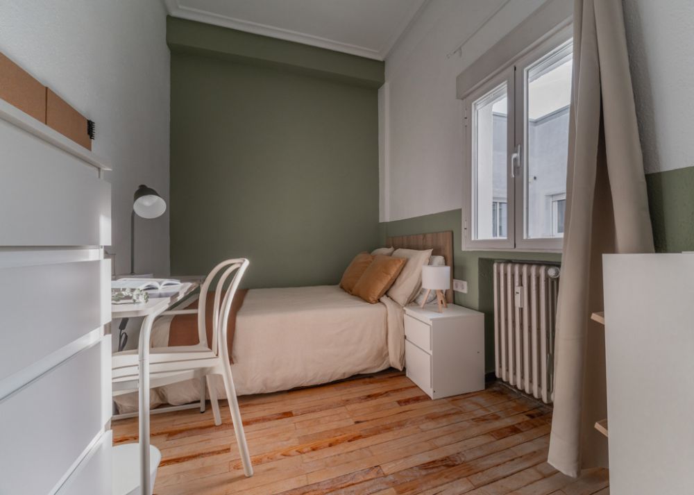 Bright room in Atocha, in a shared apartment, ideal for international students and young professionals. The room is equipped with everything needed to enjoy your stay; it has a double bed (120 cm), a wardrobe, a desk with a chair and lamp, a dresser, a nightstand, and a shoe rack. The room has an area of 7.86 m², a window, central heating, and its own lock on the door for more privacy. This room is located on the seventh floor of the building. The kitchen and dining room are shared with the other tenants of the apartment. For more details, we invite you to view the floor plan and location of the room. *Bedding is not included, only the mattress cover is provided. - Don't smoke - Pets are not allowed - Parties are forbidden - Take out the trash daily - Short-term visits are allowed - be informed that in this flat a device has been installed in order to allow the monitoring of the noise level (decibels) 24 hours a day. The system emits an alert whenever the sound level exceeds the maximum allowed by the Community of Madrid, mainly between 11pm and 6am.