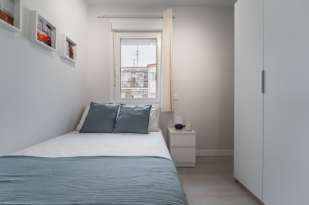 Modern room on Ganges Street. The size of the room is 6.63 m². Furnished with a 120 cm bed, bedside table with lamp, mirror, three-door wardrobe, and desk with chair and lamp. Heating by heat pump from the air conditioning unit. The kitchen, dining room, and bathrooms are shared with the other tenants. *Bed linen is not included, only the mattress cover is provided. - No smoking. - No pets allowed. - No parties allowed. - Take out the rubbish daily. - Short-term visitors are allowed. - be informed that this flat is equipped with a device that monitors noise levels or decibels 24 hours a day, issuing an alert when the sound level exceeds the maximum allowed by the Community of Madrid, mainly between 11 p.m. and 6 a.m.