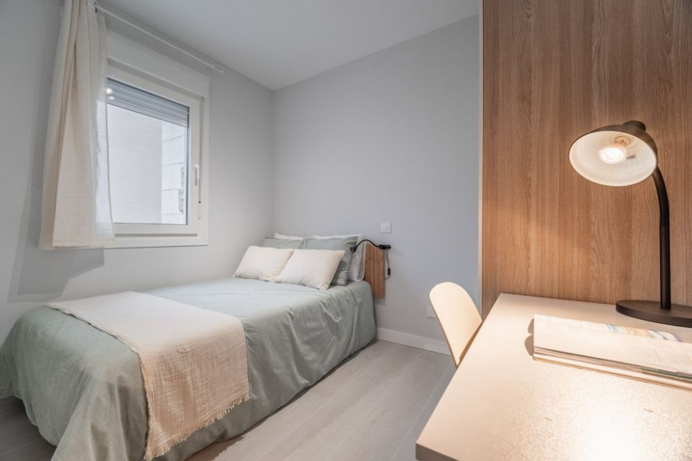 Bright room on Ganges Street. The size of the room is 6.90 m². Furnished with a 120 cm bed, bedside table with lamp, mirror, shelf, individual wardrobe, and desk with chair and lamp. Heating by heat pump from the air conditioning unit. The kitchen, dining room, and bathrooms are shared with the other tenants. *Bed linen is not included, only the mattress cover is provided. - No smoking. - No pets allowed. - No parties allowed. - Take out the rubbish daily. - Short-term visitors are allowed. - be informed that this flat is equipped with a device that monitors noise levels or decibels 24 hours a day, issuing an alert when the sound level exceeds the maximum allowed by the Community of Madrid, mainly between 11 p.m. and 6 a.m.